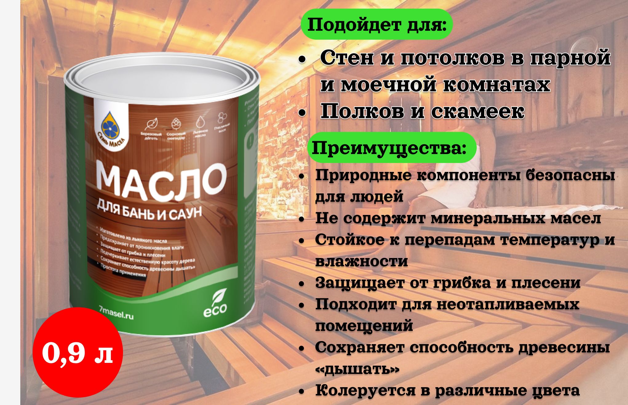 Баню можно эксплуатировать через 72 часа. Наносить в 1–2 слоя в зависимости от типа и качества обработки древесины. При необходимости колеровки добавьте пигмент «Семь масел». При колеровки первый слой наносится цветной, последний бесцветный. Колерованное масло необходимо перемешивать во время нанесения раз в 5–7 минут. Инструмент очистить раствором тёплой мыльной воды. При нанесении и высыхании масла обеспечьте приток свежего воздуха.