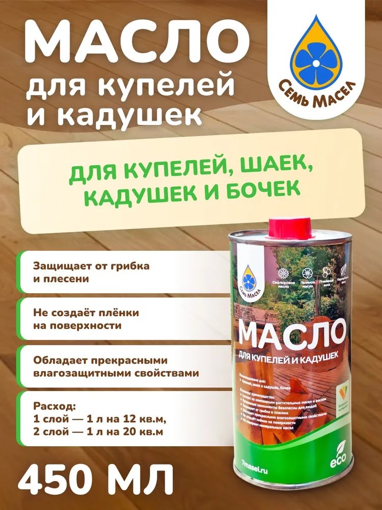 Через 24 часа нанесите повторный слой аналогично первому. Наносить в 1–3 слоя в зависимости от типа и качества обработки древесины. При необходимости колеровки добавьте пигмент «Семь масел». При колеровки первый слой наносится цветной, последний бесцветный. Колерованное масло необходимо перемешивать во время нанесения раз в 5–7 минут. Инструмент очистить раствором тёплой мыльной воды. При нанесении и высыхании масла обеспечьте приток свежего воздуха.