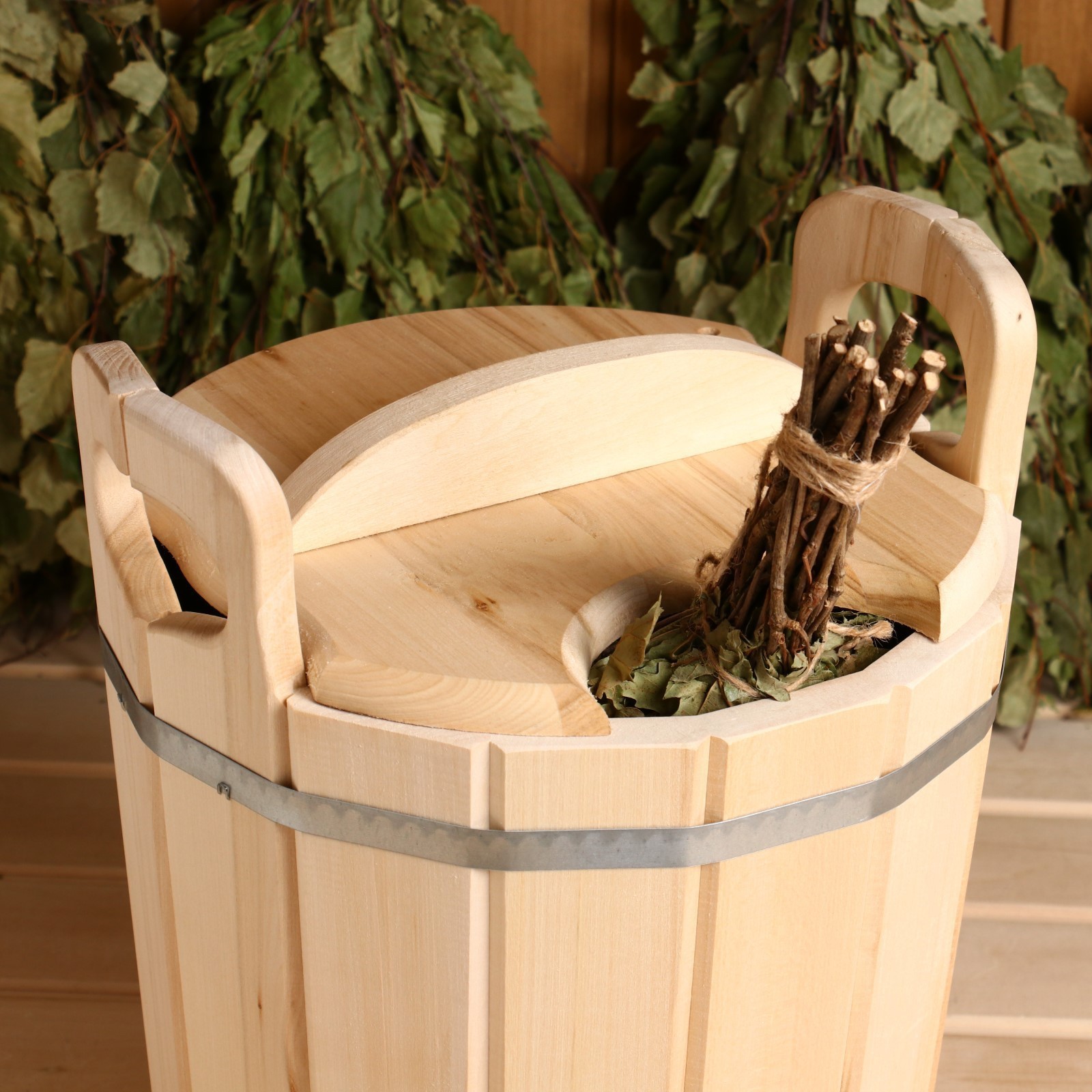 Удобная крышка с прорезью для ручки банного веника.